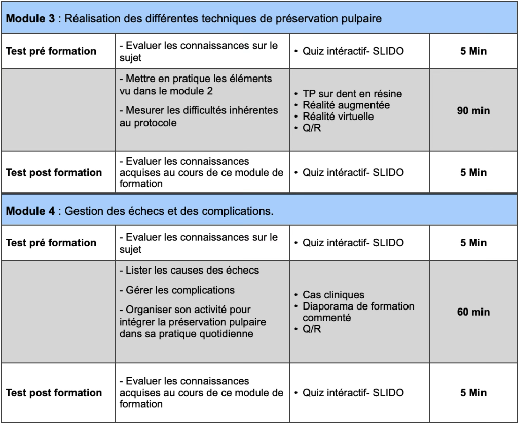 Module 2 : Description des différentes techniques de préservation pulpaire Test pré formation – Evaluer les connaissances sur le sujet Quiz intéractif- SLIDO 5 Min Citer les pré-requis à la réalisation d’un soin de préservation pulpaire Exécuter les différents protocoles. Argumenter son choix de biomatériau Organiser son environnement de travail selon les techniques Diaporama de formation commenté Réalité Augmentée Réalité Virtuelle Jeu pédagogique Cas cliniques commentés Q/R 90 min Test post formation – Evaluer les connaissances acquises au cours de ce module de formation Quiz intéractif- SLIDO 5 min
